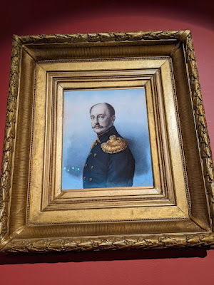 Буквально несколько слов скажу об этом историческом доме. Известен он аж с начала XVII в., когда в нём располагался загородный двор бояр Салтыковых. Владение домом передавалось от одного хозяину к другому, очень сильно здание пострадало во время Московского пожара 1812 г. В 1816 г. его хозяином стал участник Бородинского сражения генерал-майор Измайловского полка Александр Иванович Талызин. После его смерти в 1847 г. дом достался родственнице, титулярной советнице Талызиной, в тот же год здесь поселяется возвратившийся из Европы граф Александр Петрович Толстой. Скорее всего, его супруга, Анна Георгиевна, купила эту усадьбу где-то в 1847-1848 гг. В 1848 г. сюда поселяется Н.В. Гоголь. Портрет графини А.Г. Толстой, которая, как гласит надпись, имела большое влияние на писателя:
