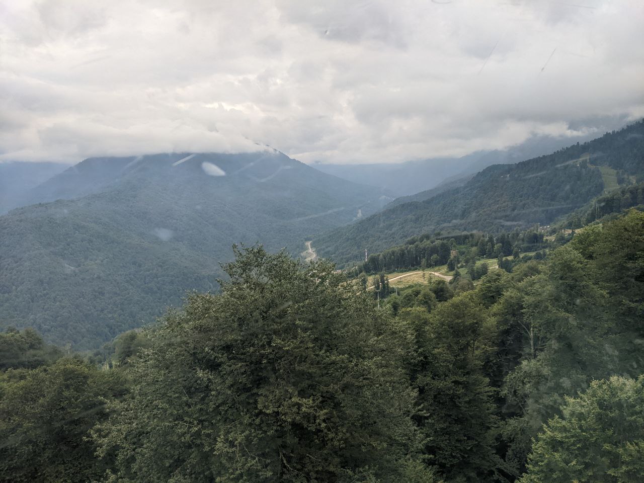 Как нам сказали, кабинки сделаны совместно на заводах Австрии и Швейцарии, а канатные вышки были изготовлены в нашей Самаре. Конечно, так ехать очень безопасно, а дорога идёт быстрее, чем скажем, к Ай-Петри в Крыму. Местами кабинка разгонялась, а по пути туда раскачивалась, но высота была не особая. Давайте полюбуемся этой первой красотой, которая открывается нашему взору: